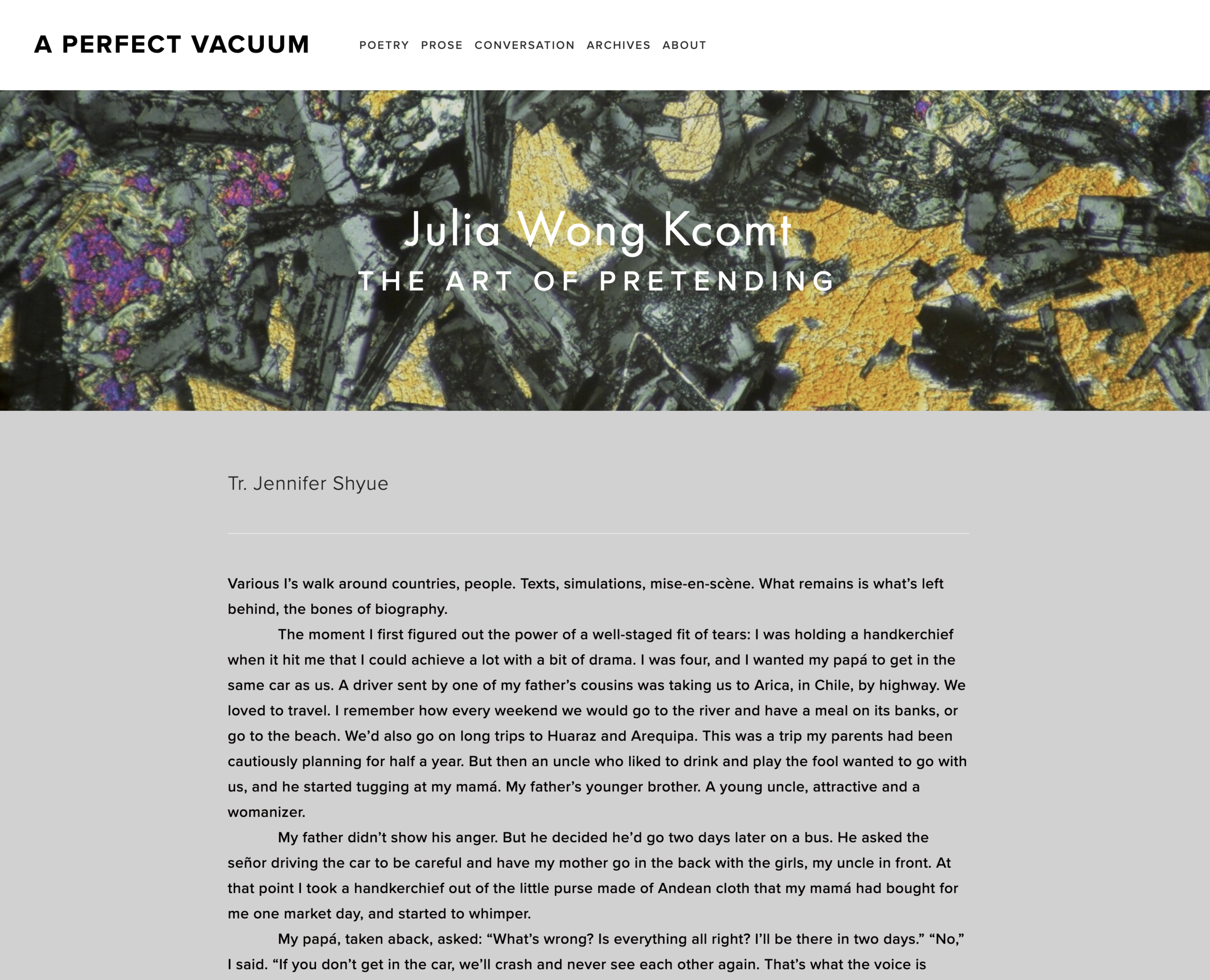 “The Art of Pretending” is a translation of “El arte del buen fingir,” an excerpt from tusán/Chinese Peruvian writer Julia Wong Kcomt’s hybrid prose work Pessoa por Wong. This excerpt was published in the October 2020 issue of A Perfect Vacuum. Translated from Spanish.